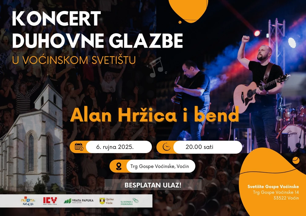 Voćin će početkom rujna ponovno biti središte duhovne radosti i glazbene ljepote. U subotu, 6. rujna 2025., s početkom u 20 sati, na Trgu Gospe Voćinske održat će se koncert duhovne glazbe Alana Hržice i Benda.