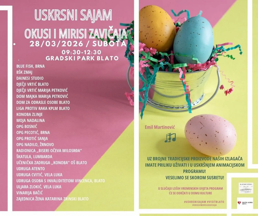 Tematska gastro manifestacija „Okusi mirisi zavičaja - Uskrsni sajam u Blatu“ održat će se u subotu, 28. ožujka, od 9:30 do 12:30 sati u Gradskom parku u Blatu. Tradicionalno se organizira uoči Cvjetnice te i ove godine okuplja brojne izlagače s područja Blata i otoka Korčule.